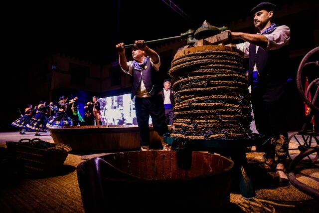 This festivity was created in 1972 by a group of local wine-producers, and in its early days wine cellars and some villages of the Denomination of Origin of Jumilla took part; until recent years that different groups and farmer associations also participated giving room to the creation of clubs,which were brought together in the "Federación de Peñas de la Fiesta de la Vendimia" (Federation of Peñas of the Wine Harvest Festivities). All acts offered in it revolve around wine and its culture, showing all its labors, such as wine harvest, treading, production and tasting, organising numerous activities for people of all ages and in which fun is guaranteed: Inauguration of the Fuente del Vino, Ofrenda de Uvas and Primer Mosto al Niño de las Uvas, Cabalgata Infantil, Cabalgata del Vino, etc.